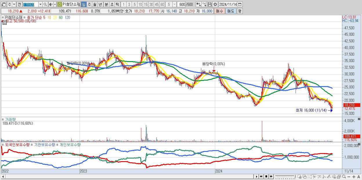 - PI첨단소재 (18,210원 ▲ 12.41% , 시총: 5,348억, 거래량: 109,471, 거래대금:19억)