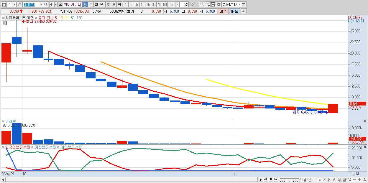 2.차이커뮤니케이션 8,590원 ▲ 29.95% (KOSDAQ, 351870)