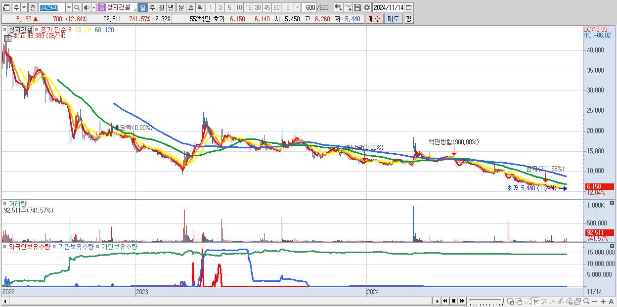 - 상지건설 (6,150원 ▲ 12.84% , 시총: 245억, 거래량: 92,511, 거래대금:6억)