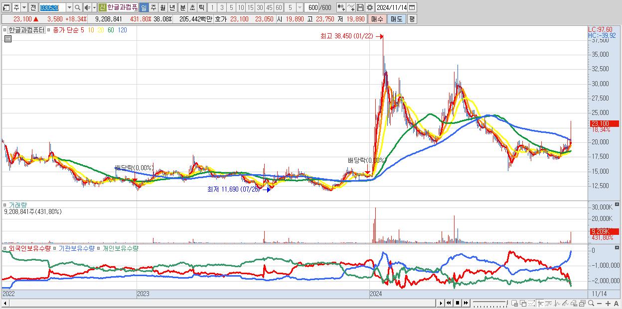 - 한글과컴퓨터 (23,100원 ▲ 18.34% , 시총: 5,586억, 거래량: 9,208,841, 거래대금:2,054억)