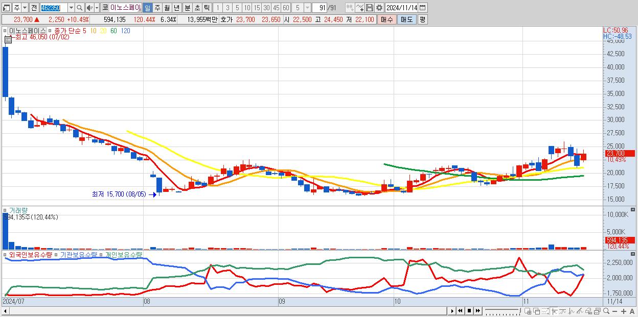 - 이노스페이스 (23,700원 ▲ 10.49% , 시총: 2,222억, 거래량: 594,135, 거래대금:140억)