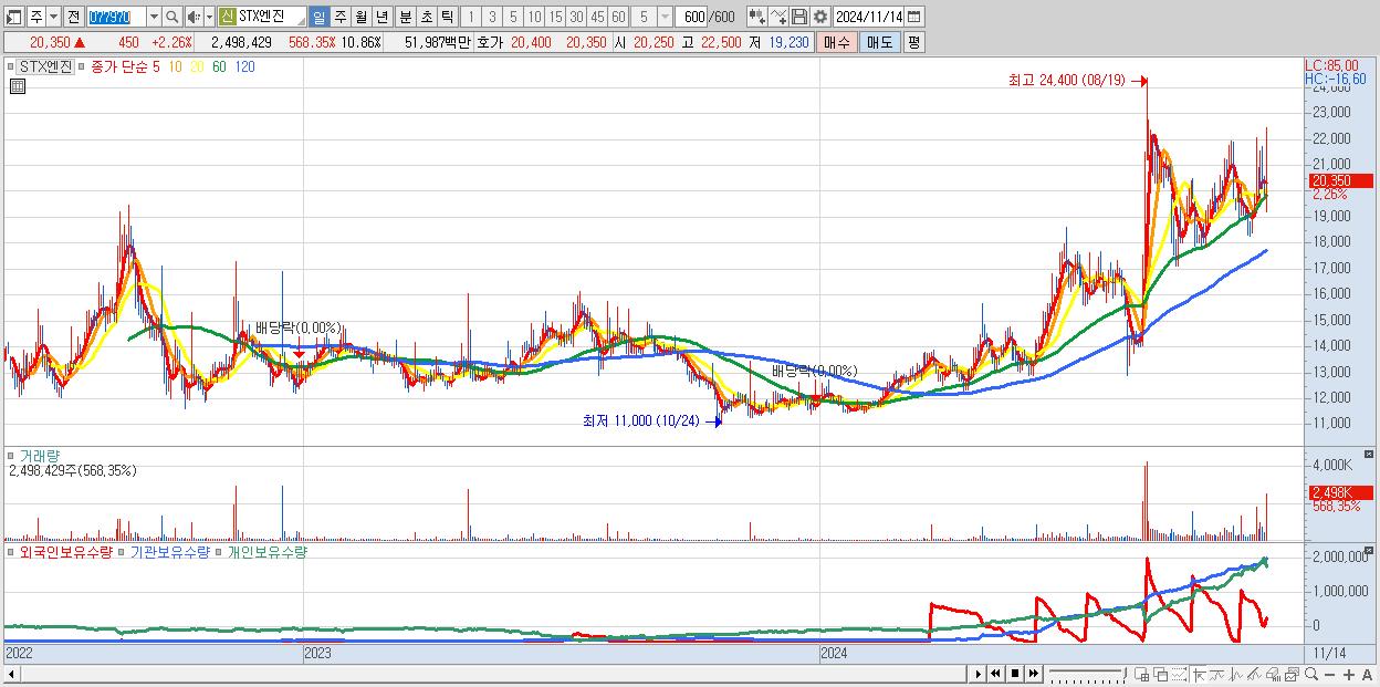 - STX엔진 (20,350원 ▲ 2.26% , 시총: 4,682억, 외국인 순매수 거래금:35억)