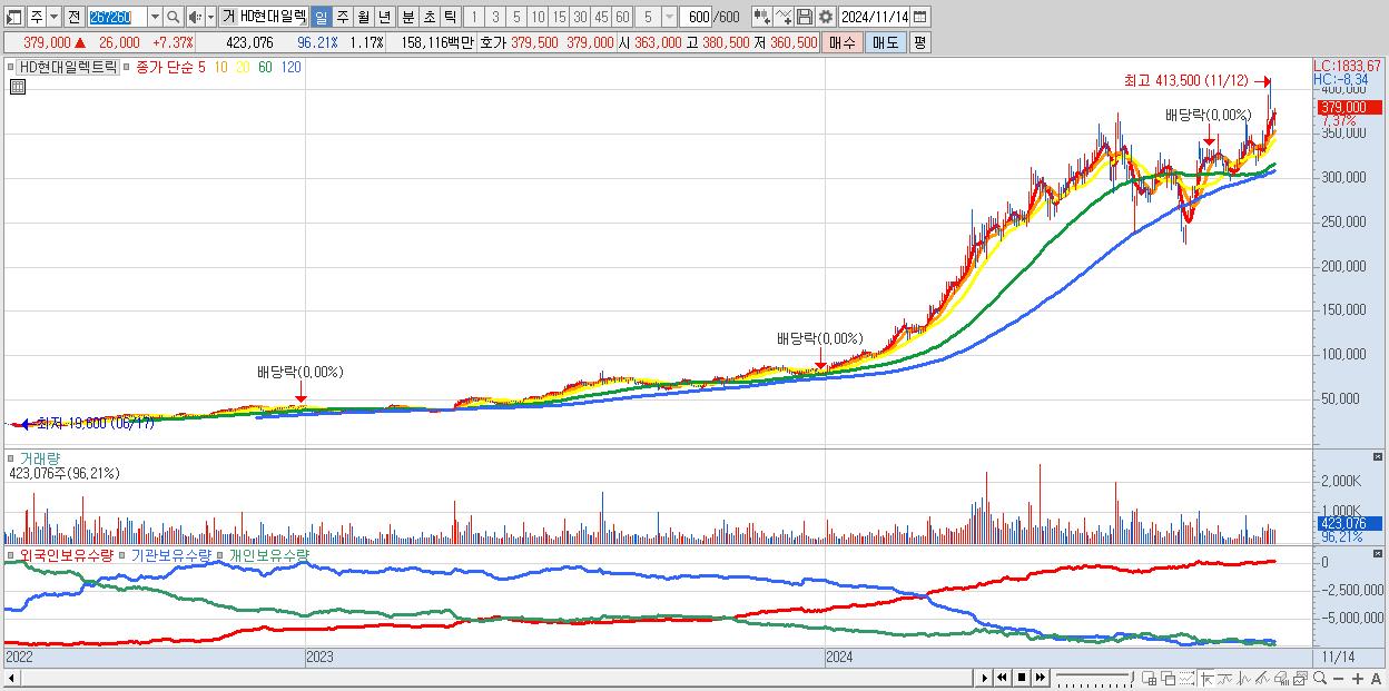 - HD현대일렉트릭 (379,000원 ▲ 7.37% , 시총: 136,619억, 외국인 순매수 거래금:150억)