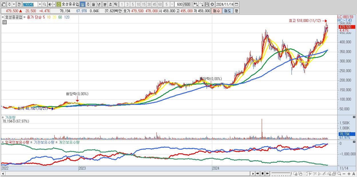 - 효성중공업 (479,500원 ▲ 4.47% , 시총: 44,711억, 외국인 순매수 거래금:59억)