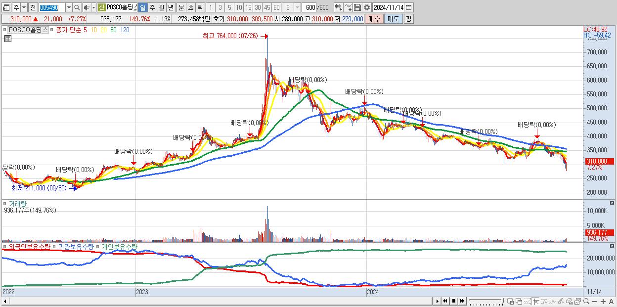 - POSCO홀딩스 (310,000원 ▲ 7.27% , 시총: 256,136억, 외국인 순매수 거래금:78억)