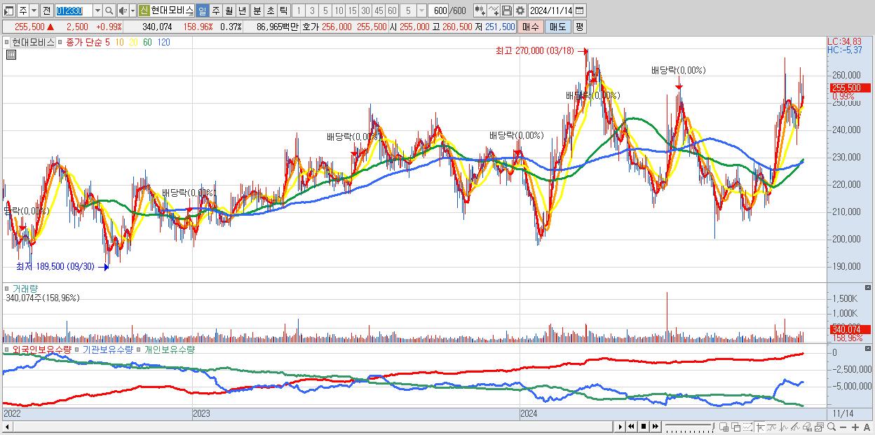 - 현대모비스 (255,500원 ▲ 0.99% , 시총: 237,602억, 외국인 순매수 거래금:103억)