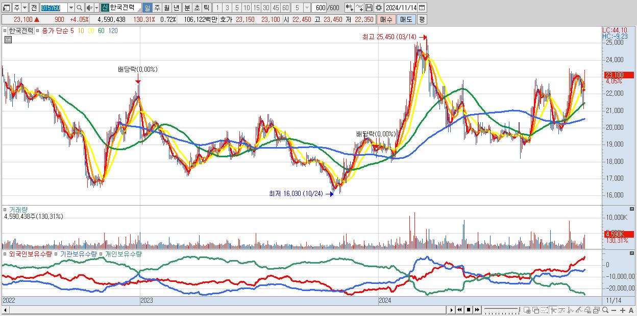 - 한국전력 (23,100원 ▲ 4.05% , 시총: 148,294억, 외국인 순매수 거래금:185억)