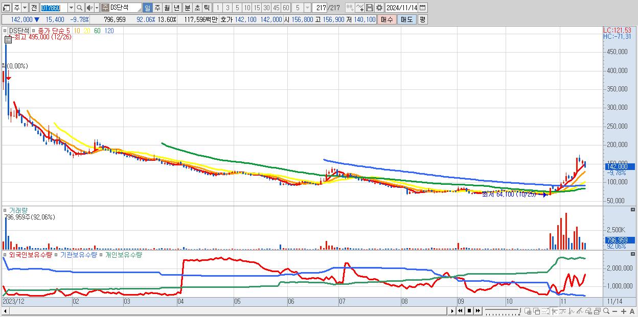 - DS단석 (142,000원 ▼ -9.78% , 시총: 8,323억, 외국인 순매수 거래금:65억)