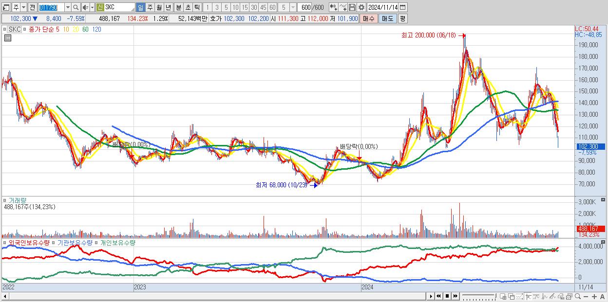 - SKC (102,300원 ▼ -7.59% , 시총: 38,739억, 외국인 순매수 거래금:44억)