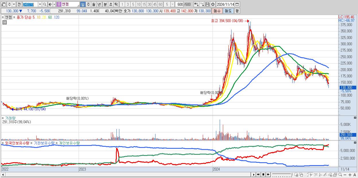 - 엔켐 (130,300원 ▼ -5.58% , 시총: 27,085억, 외국인 순매수 거래금:72억)