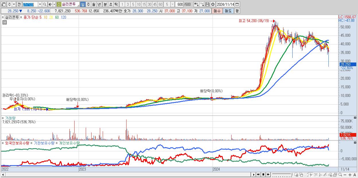 - 실리콘투 (28,250원 ▼ -22.6% , 시총: 17,197억, 외국인 순매수 거래금:97억)