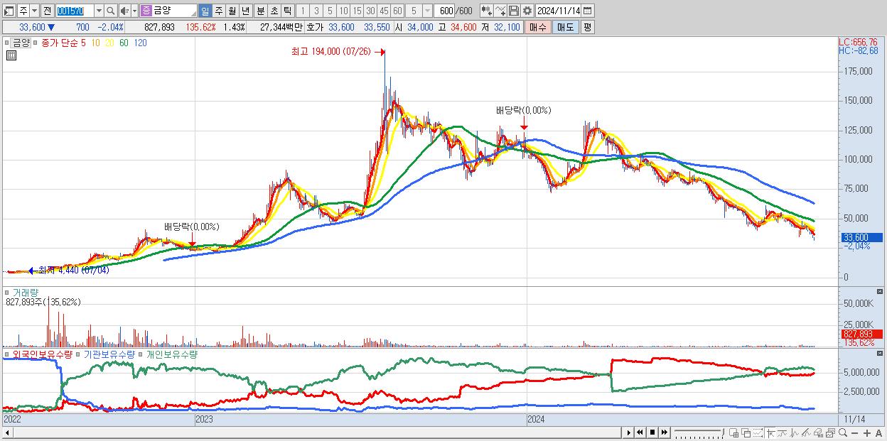 - 금양 (33,600원 ▼ -2.04% , 시총: 19,505억, 외국인 순매수 거래금:40억)