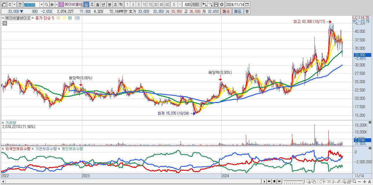 - 에이비엘바이오 (33,000원 ▼ -2.65% , 시총: 15,856억, 외국인 순매수 거래금:120억)