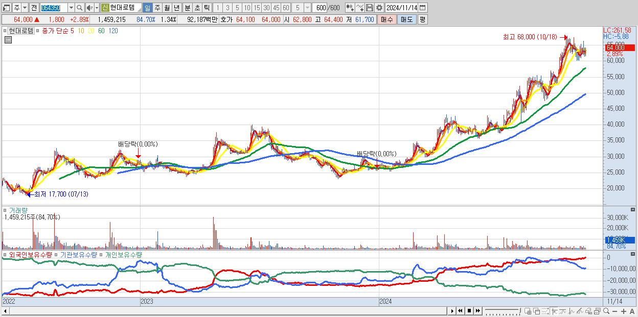 - 현대로템 (64,000원 ▲ 2.89% , 시총: 69,851억, 외국인 순매수 거래금:191억)