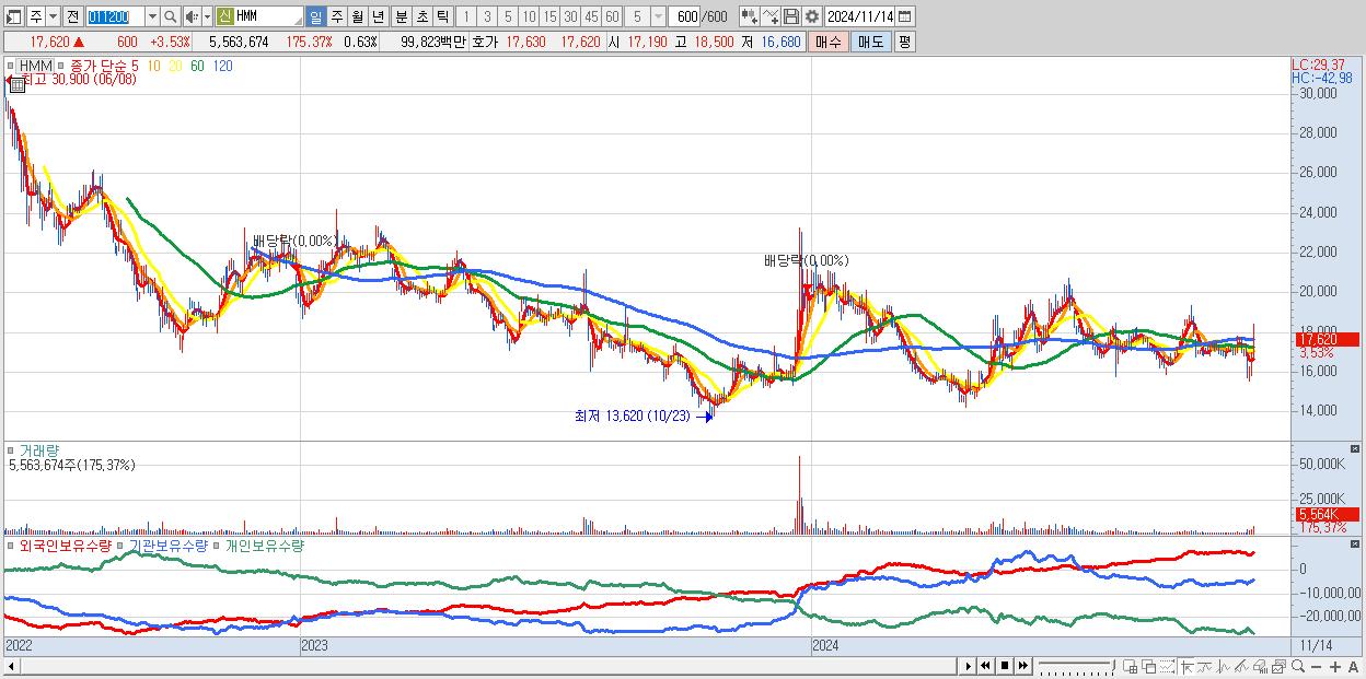 - HMM (17,620원 ▲ 3.53% , 시총: 155,239억, 외국인 순매수 거래금:156억)