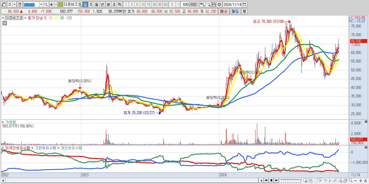 - 더존비즈온 (66,500원 ▲ 7.09% , 시총: 20,205억, 외국인 순매수 거래금:36억)