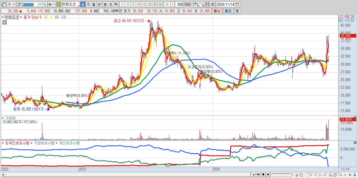 - 한화오션 (39,200원 ▲ 15.98% , 시총: 120,114억, 외국인 순매수 거래금:124억)