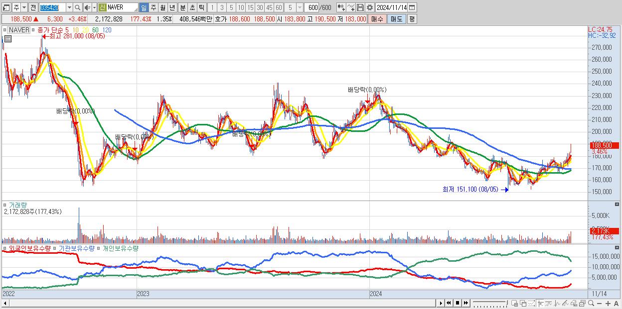 - NAVER (188,500원 ▲ 3.46% , 시총: 303,079억, 거래량: 2,172,828, 거래대금:4,085억)