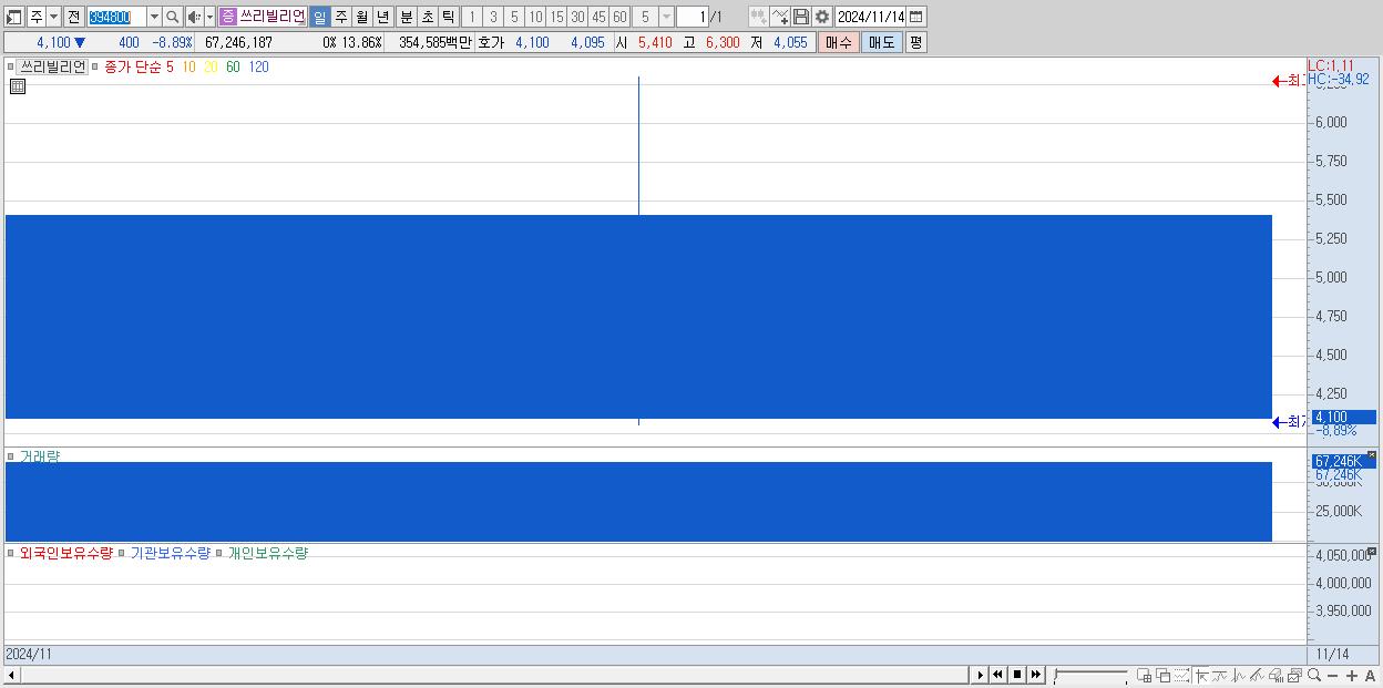 - 쓰리빌리언 (4,100원 ▼ -8.89% , 시총: 1,289억, 거래량: 67,246,187, 거래대금:3,546억)