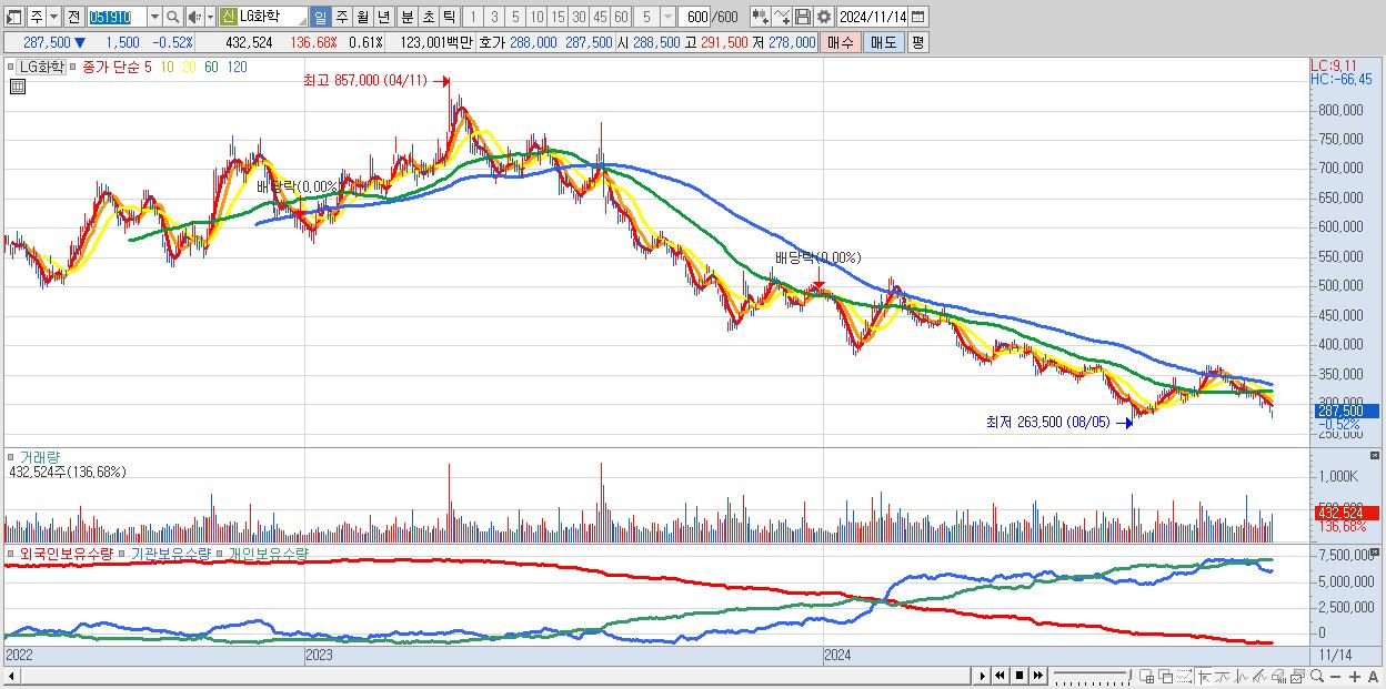 - LG화학 (287,500원 ▼ -0.52% , 시총: 202,953억, 거래량: 432,524, 거래대금:1,230억)