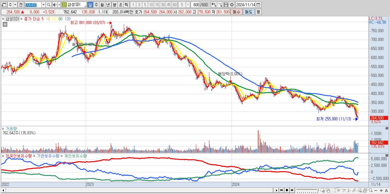 - 삼성SDI (264,500원 ▲ 3.52% , 시총: 181,882억, 거래량: 762,642, 거래대금:2,030억)