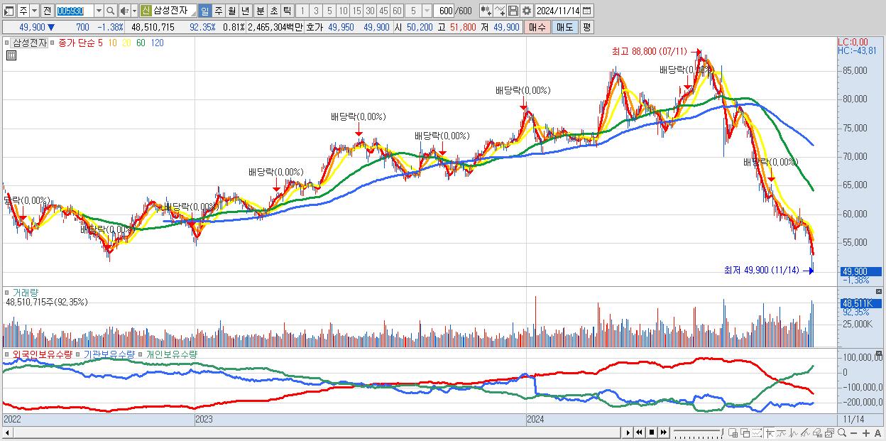 - 삼성전자 (49,900원 ▼ -1.38% , 시총: 2,978,921억, 거래량: 48,510,715, 거래대금:24,653억)
