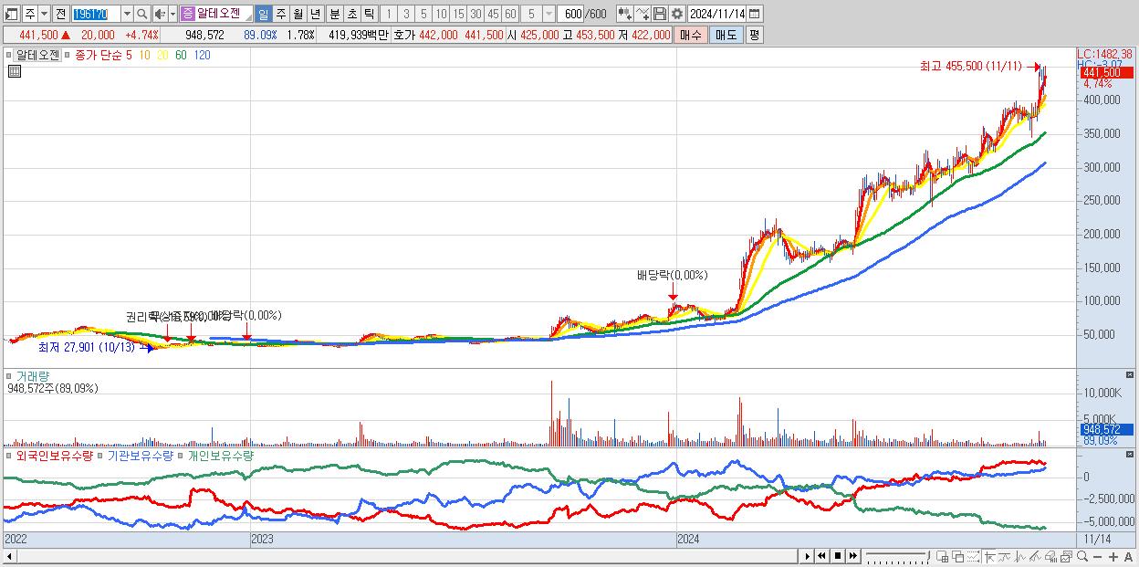 - 알테오젠 (441,500원 ▲ 4.74% , 시총: 235,403억, 거래량: 948,572, 거래대금:4,199억)