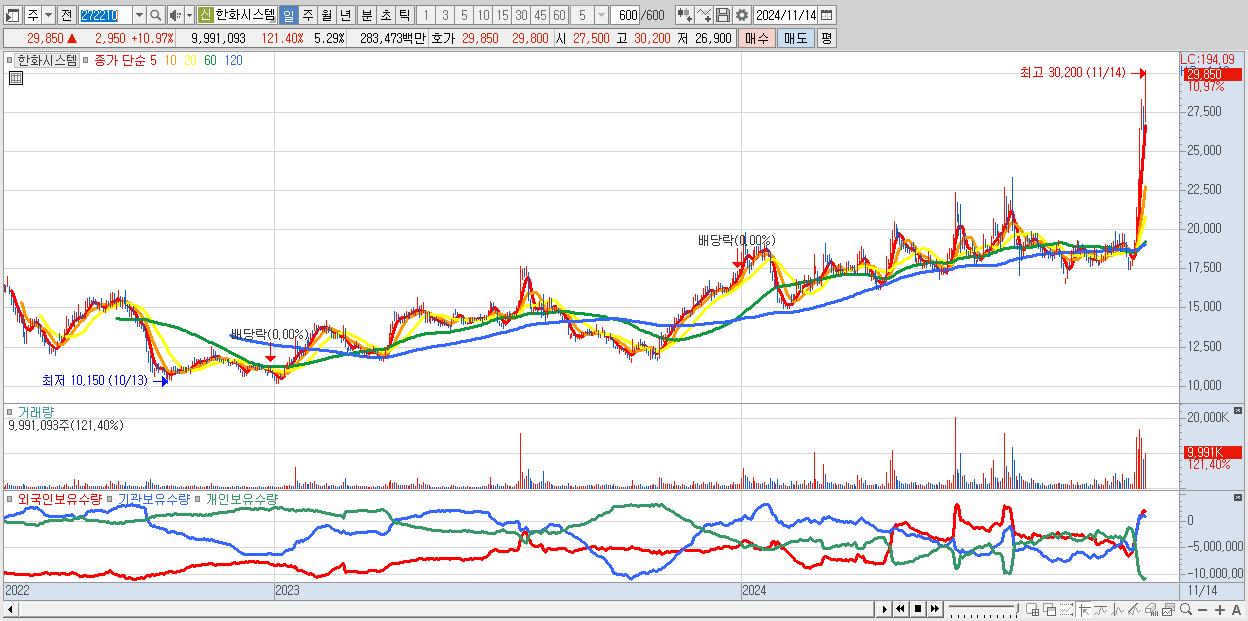 - 한화시스템 (29,850원 ▲ 10.97% , 시총: 56,392억, 거래량: 9,991,093, 거래대금:2,835억)