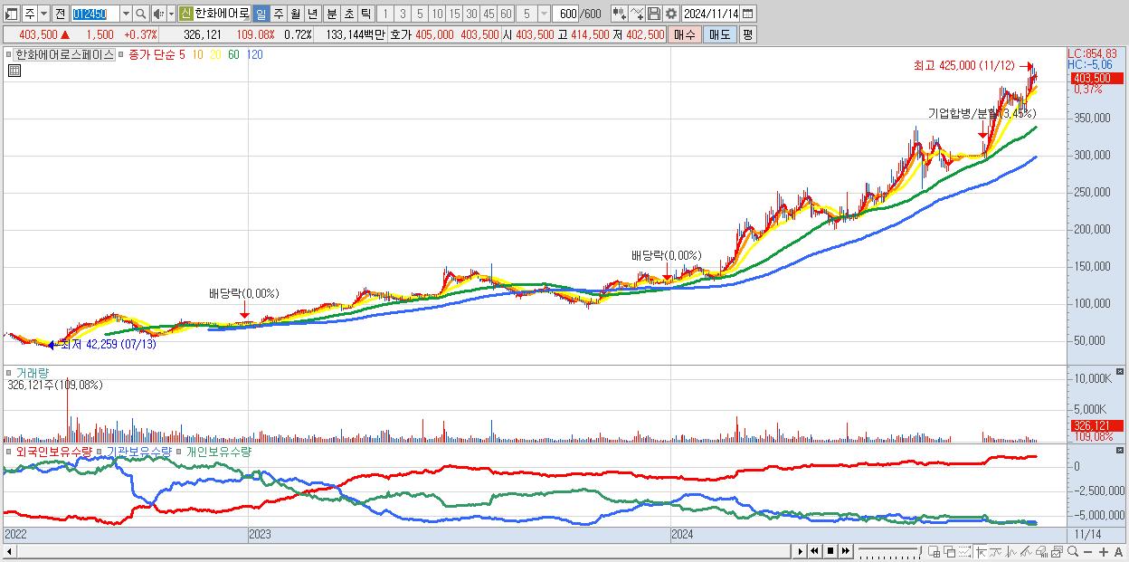 - 한화에어로스페이스 (403,500원 ▲ 0.37% , 시총: 183,920억, 거래량: 326,121, 거래대금:1,331억)