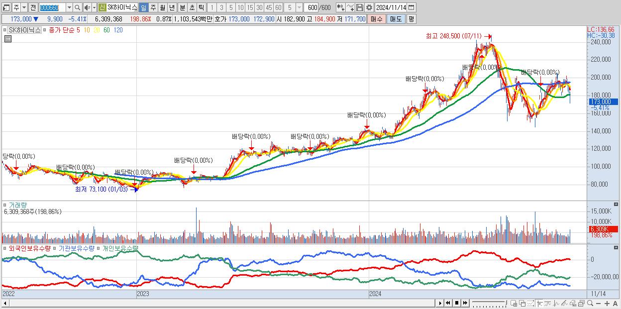 - SK하이닉스 (173,000원 ▼ -5.41% , 시총: 1,259,444억, 거래량: 6,309,368, 거래대금:11,035억)
