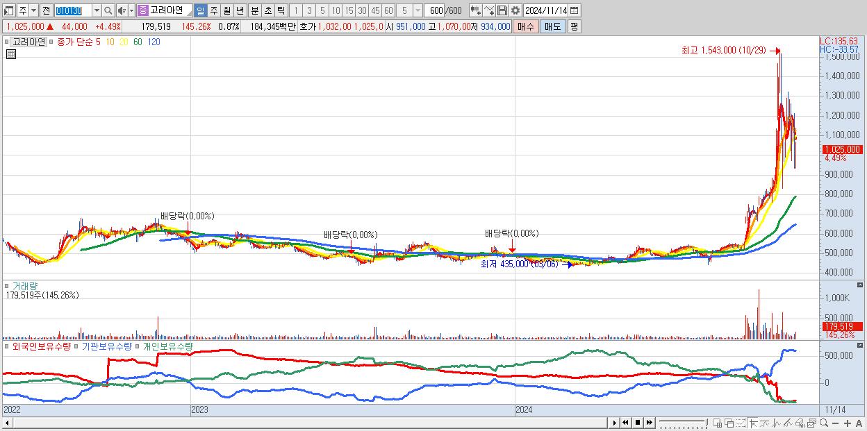 - 고려아연 (1,025,000원 ▲ 4.49% , 시총: 212,209억, 거래량: 179,519, 거래대금:1,843억)