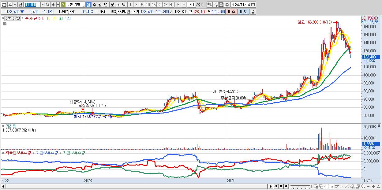 - 유한양행 (122,400원 ▼ -1.13% , 시총: 98,176억, 거래량: 1,567,830, 거래대금:1,937억)