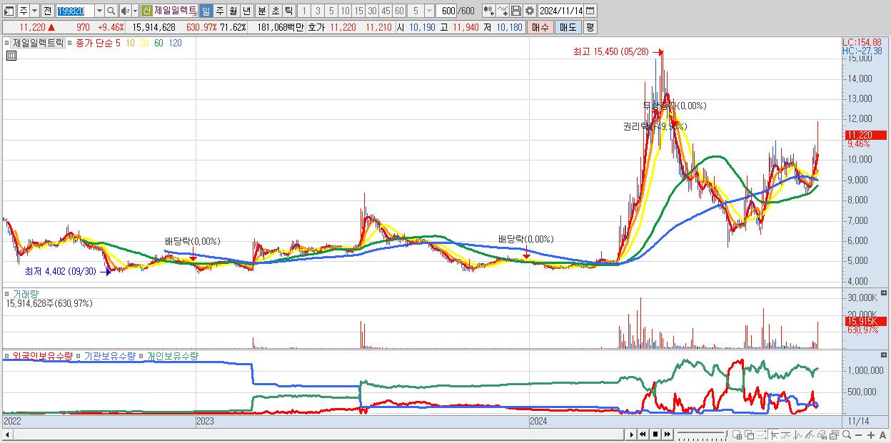 - 제일일렉트릭 (11,220원 ▲ 9.46% , 시총: 2,493억, 거래량: 15,914,628, 거래대금:1,811억)