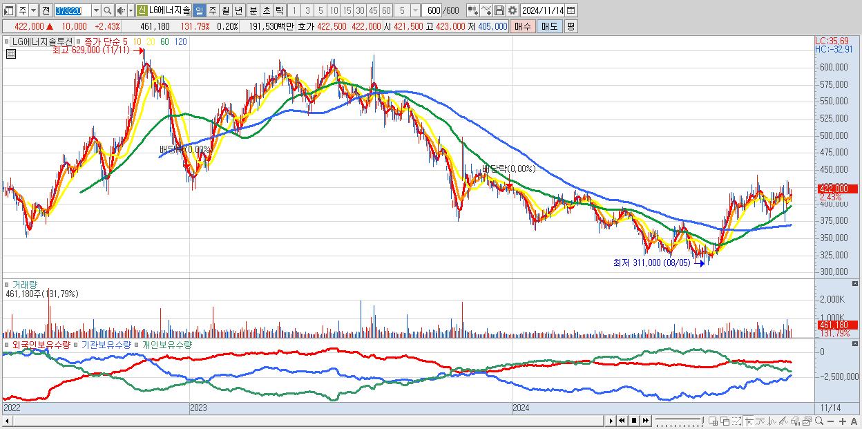 - LG에너지솔루션 (422,000원 ▲ 2.43% , 시총: 987,480억, 거래량: 461,180, 거래대금:1,915억)