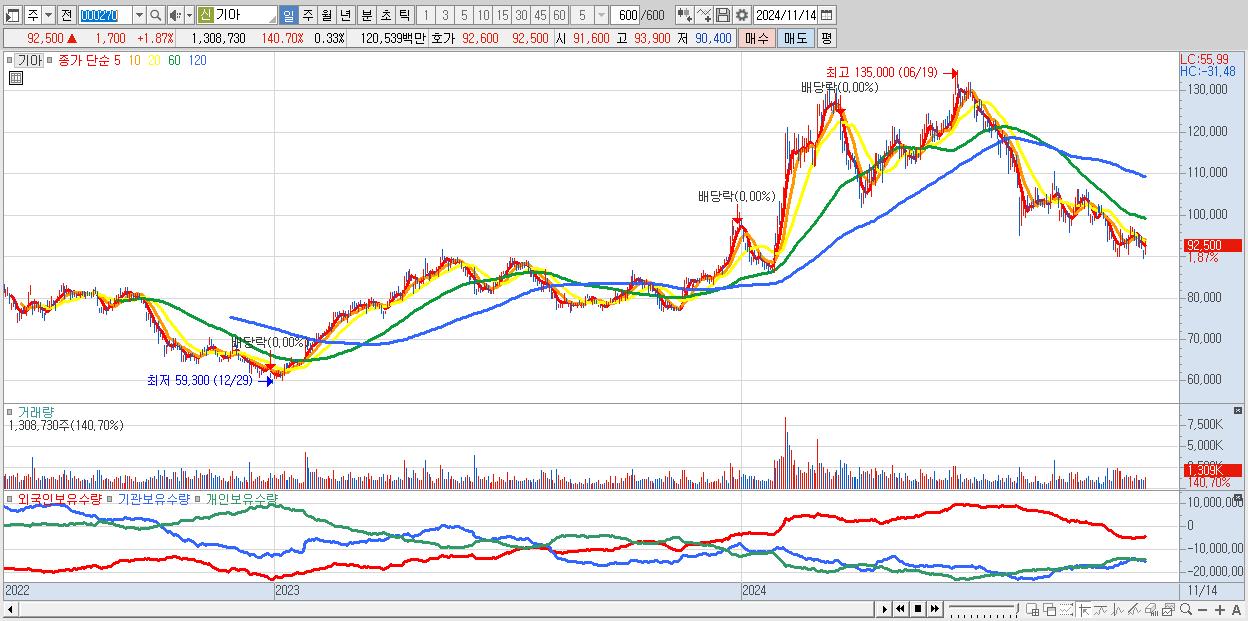 - 기아 (92,500원 ▲ 1.87% , 시총: 369,869억, 거래량: 1,308,730, 거래대금:1,205억)