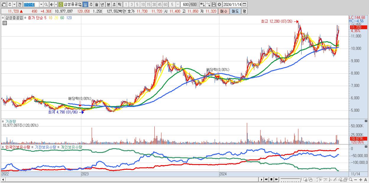 - 삼성중공업 (11,720원 ▲ 4.36% , 시총: 103,136억, 거래량: 10,977,097, 거래대금:1,276억)