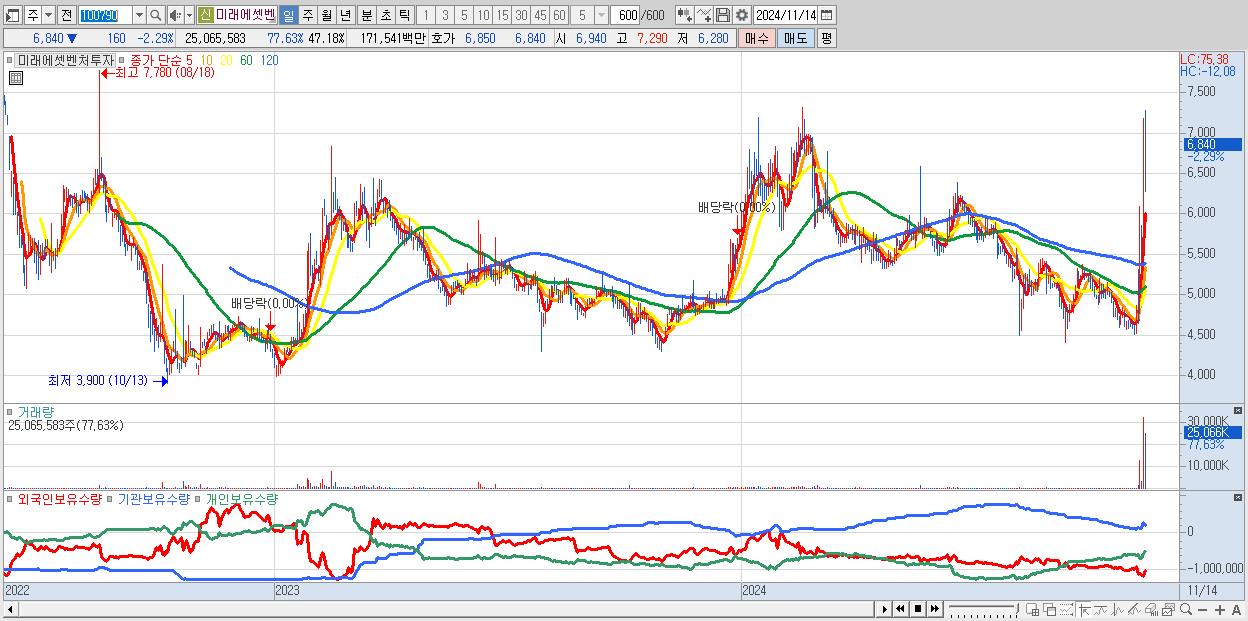 - 미래에셋벤처투자 (6,840원 ▼ -2.29% , 시총: 3,634억, 거래량: 25,065,583, 거래대금:1,715억)