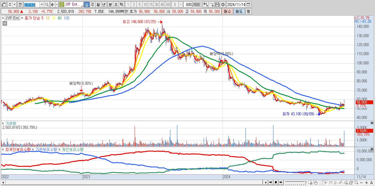 - JYP Ent. (56,800원 ▲ 5.77% , 시총: 20,182억, 거래량: 2,503,819, 거래대금:1,449억)