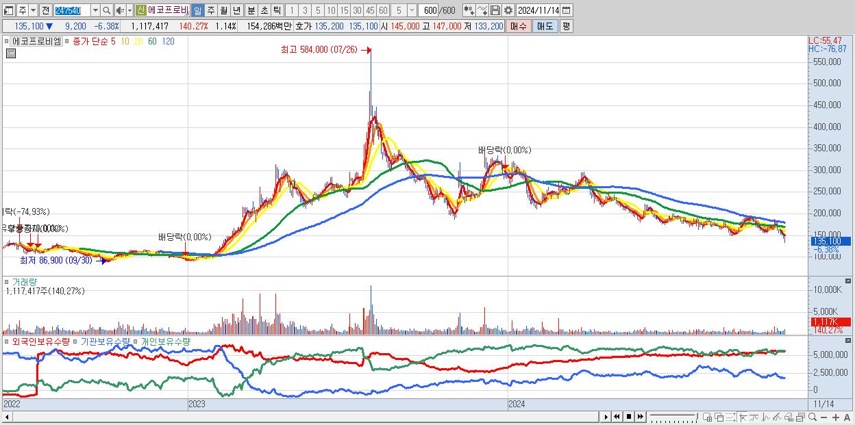 - 에코프로비엠 (135,100원 ▼ -6.38% , 시총: 132,130억, 거래량: 1,117,417, 거래대금:1,543억)