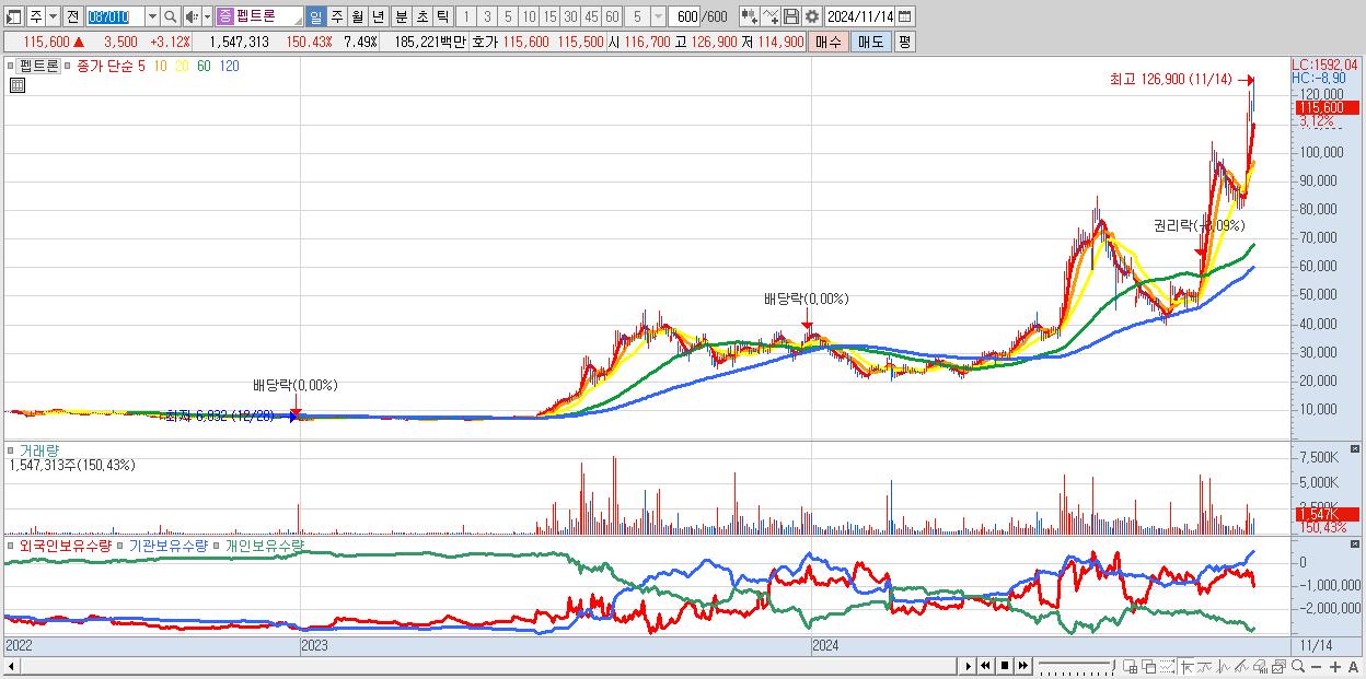 - 펩트론 (115,600원 ▲ 3.12% , 시총: 23,880억, 거래량: 1,547,313, 거래대금:1,852억)