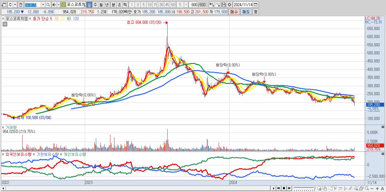 - 포스코퓨처엠 (185,200원 ▼ -6.09% , 시총: 143,462억, 거래량: 954,028, 거래대금:1,780억)