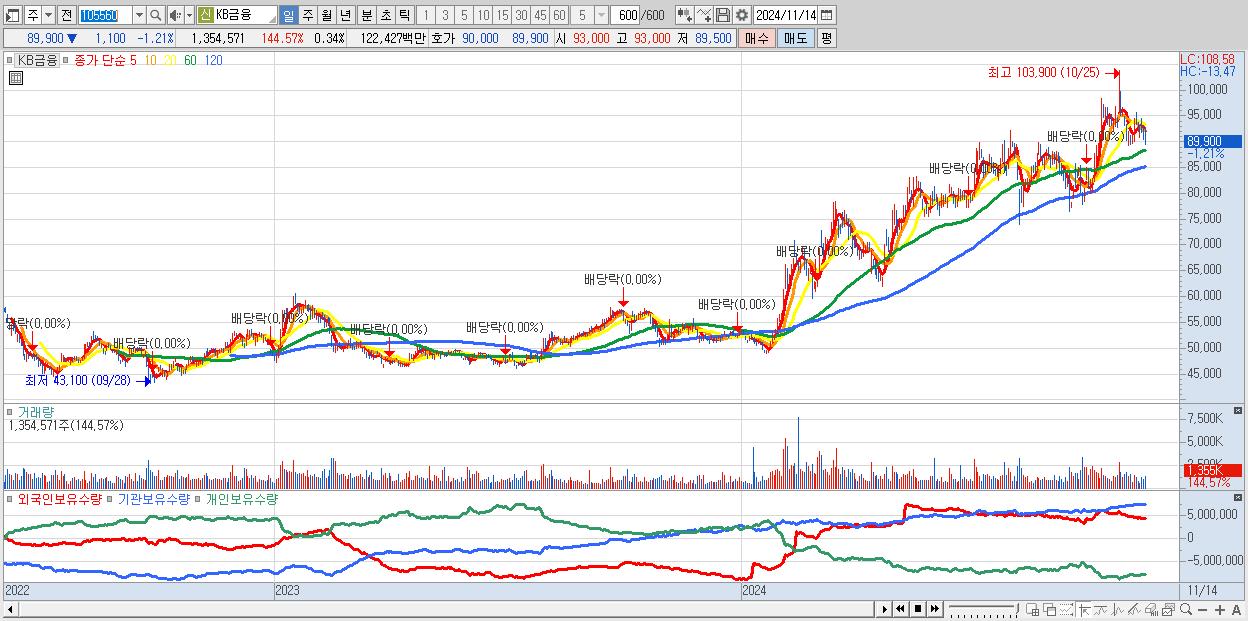 - KB금융 (89,900원 ▼ -1.21% , 시총: 353,782억, 거래량: 1,354,571, 거래대금:1,224억)