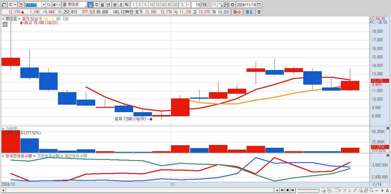 - 루미르 (12,170원 ▲ 9.94% , 시총: 2,088억, 거래량: 11,252,813, 거래대금:1,431억)