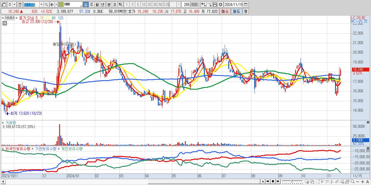- HMM (18,240원 ▲ 3.52% , 시총: 160,702억, 외국인 순매수 거래금:167억)