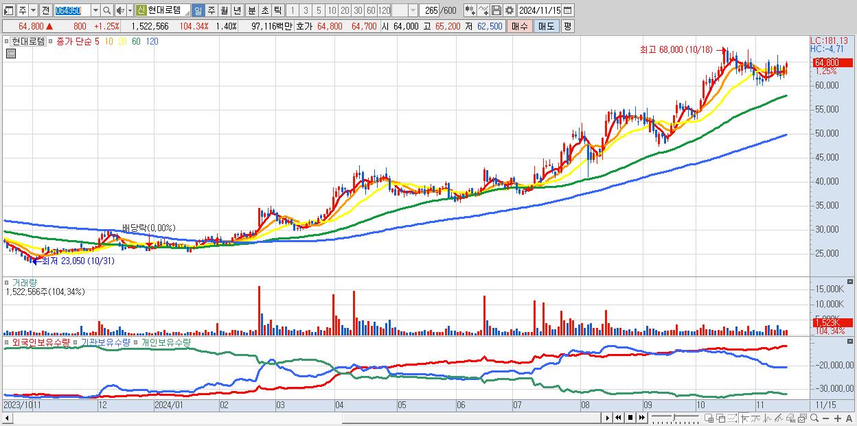 - 현대로템 (64,800원 ▲ 1.25% , 시총: 70,724억, 외국인 순매수 거래금:59억)