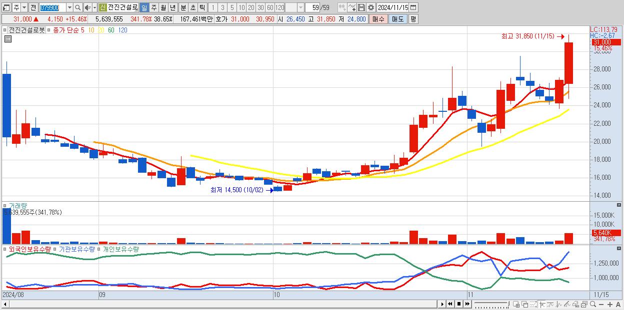 - 전진건설로봇 (31,000원 ▲ 15.46% , 시총: 4,524억, 거래량: 5,639,555, 거래대금:1,675억)