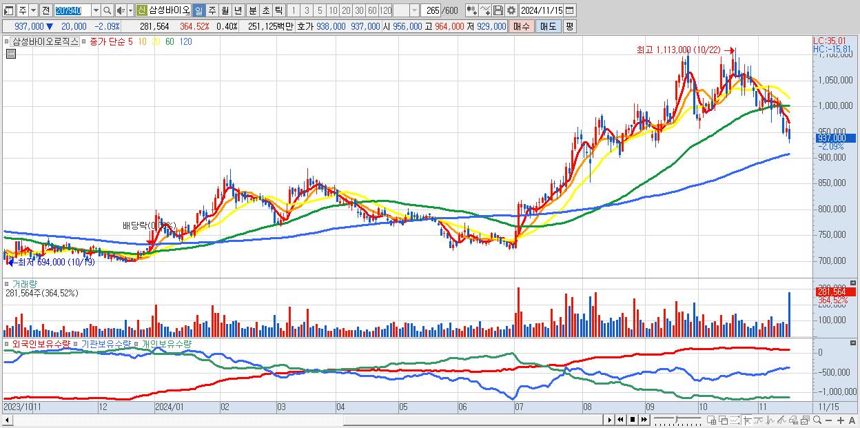 - 삼성바이오로직스 (937,000원 ▼ -2.09% , 시총: 666,900억, 거래량: 281,564, 거래대금:2,511억)