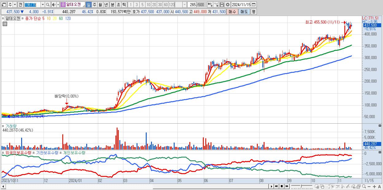 - 알테오젠 (437,500원 ▼ -0.91% , 시총: 233,270억, 거래량: 440,287, 거래대금:1,936억)