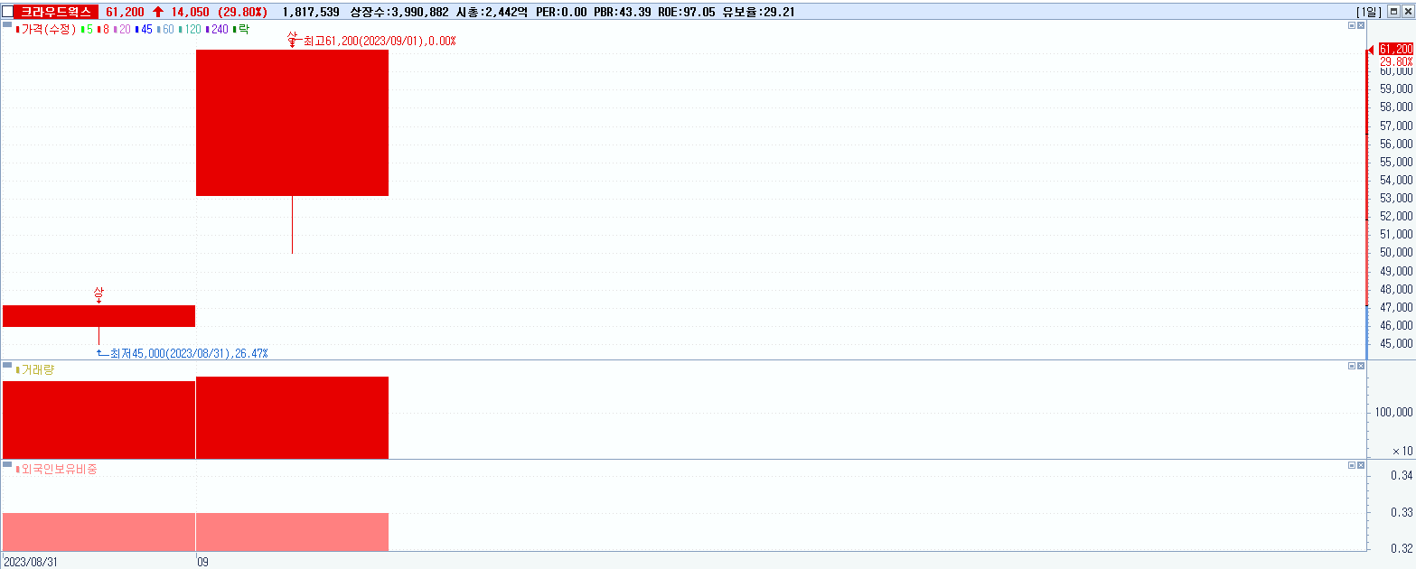 - 크라우드웍스 (61,200원 ▲ 29.8% , 시총: 2,442억, 거래량: 1,817,692, 거래대금:1,029억)