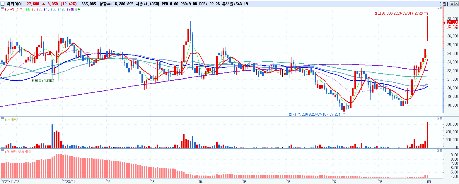 - 유티아이 (27,600원 ▲ 12.42% , 시총: 4,495억, 거래량: 665,273, 거래대금:181억)